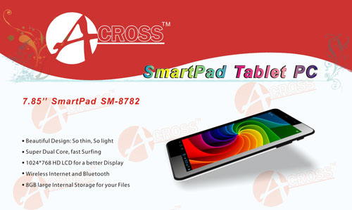 The ACROSS SM-8782 Tablet Dual Core, Dual Cam Ultra Slim series is a powerful and flexible internet and entertainment solution with a Super 7.85-inch WVGA HD 1024 x 768 capacitive touch screen and intuitive Android 4.2 operating system "Jelly Bean". Your time, your way with access to thousands of applications from marketplace, with plenty of games, social media, and productivity tools to meet the needs of today's users. With our sleek and stylish ACROSS Tablets, you are able to relax and enjoy your favorite content: music, 2160P HD videos, E-Books, and photos.