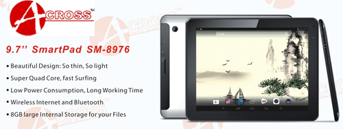 The ACROSS SM-8976 Tablet Quad Core, Dual Cam series is a powerful and flexible internet and entertainment solution with a Super 9.7-inch WVGA HD 1024 x 768 capacitive touch screen and intuitive Android 4.2 operating system "Jelly Bean". Your time, your way with access to thousands of applications from marketplace, with plenty of games, social media, and productivity tools to meet the needs of today's users. With our sleek and stylish ACROSS Tablets, you are able to relax and enjoy your favorite content: music, 2160P HD videos, E-Books, and photos.