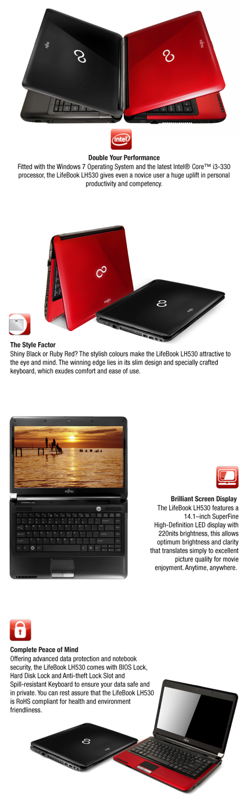 | Bundled Softwares | CyberLink PowerDVD™, Roxio Easy Media Creator, You CAM 2.5, Adobe Acrobat Reader, Fujitsu UpdateNavi, Fujitsu Power Saving Utility, Fujitsu Hardware Diagnostic Tool, Fujitsu Display Manager |