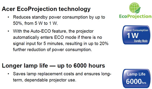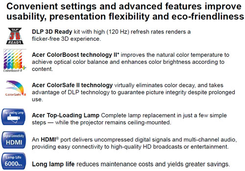 | Warranty | All of Acer projectors support a one year carry-in warranty |