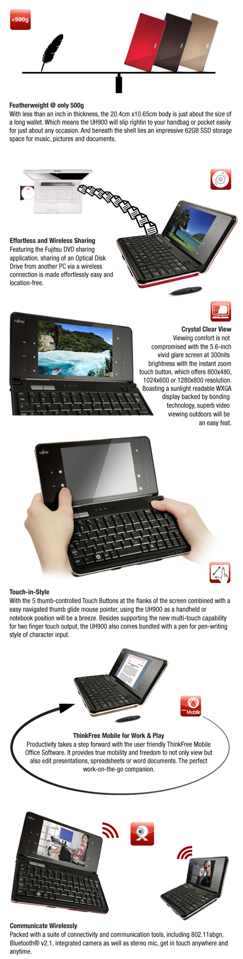 | Bundled Softwares | Roxio Easy Media Creator, Adobe Acrobat Reader, Fujitsu UpdateNavi, Fujitsu Power Saving Utility, Fujitsu Hardware Diagnostic Tool, Fujitsu Display Manager, Sun Microsystems Java Runtime, Cyberlink YouCam™, ThinkFree Mobile Office Software, Fujitsu Zoom Utility, Fujitsu Applications (Display Resolution/ECO /Calculator), Fujitsu MyRecovery, Fujitsu ODD Sharing, Windows Live Essentials (Mail, Photo Gallery, Writer, Messenger) |