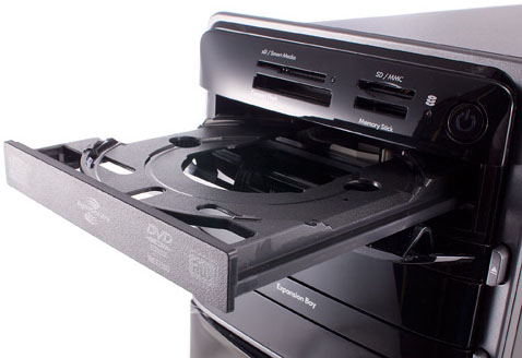 The HP Pavillion P7-1010D comes with black mid-tower case has a glossy black front panel with a four-slot card reader at the top that supports 15 different formats. Below that are two optical drive bays, one of which is occupied by a DVD multi-drive with Lightscribe etching capabilities (the other is vacant). Behind a sliding panel are headphone and microphone jacks and two USB 2.0 ports. A chrome HP badge adorns the lower left corner of the front panel.