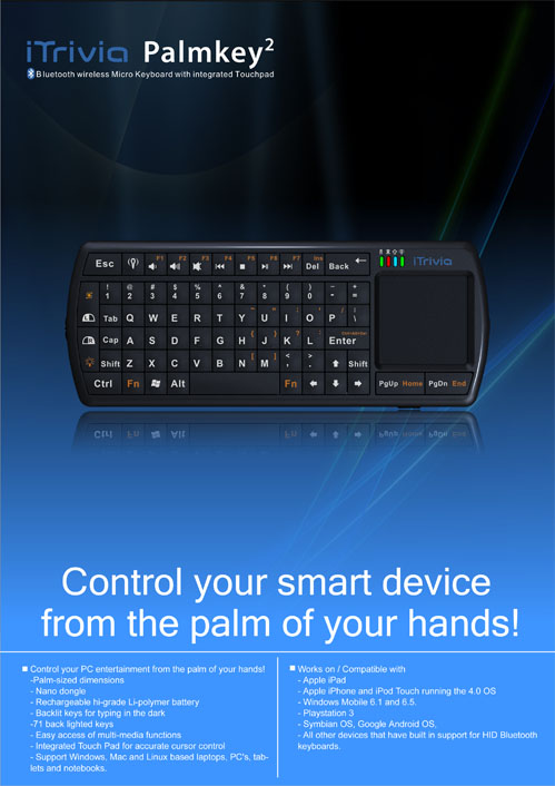 The Across iTrivia Palmkey Bluetooth handheld keyboard and mouse with laser pointer is 100% unique and its patented design and technology is making a massive splash on the portable keyboard and mouse market.