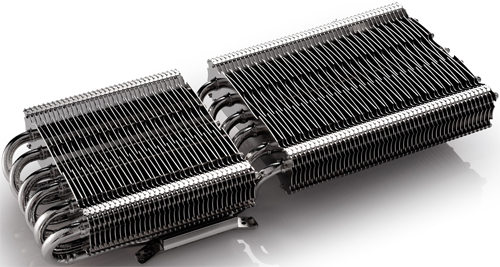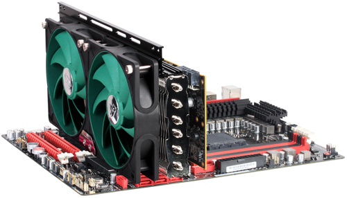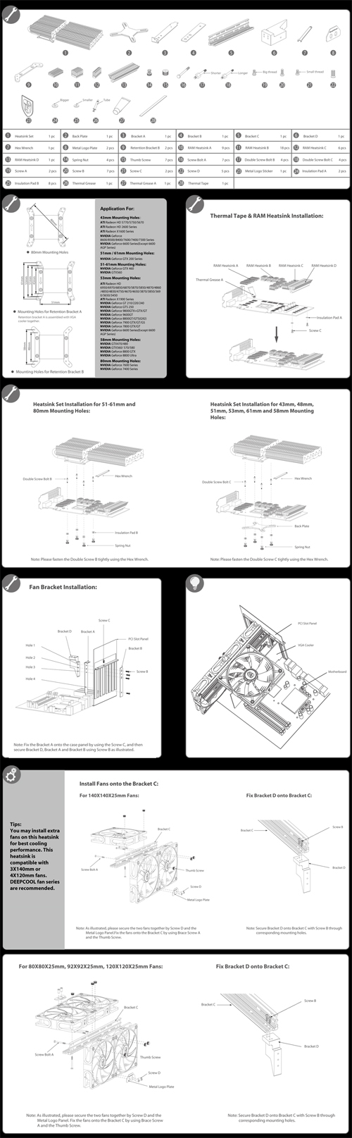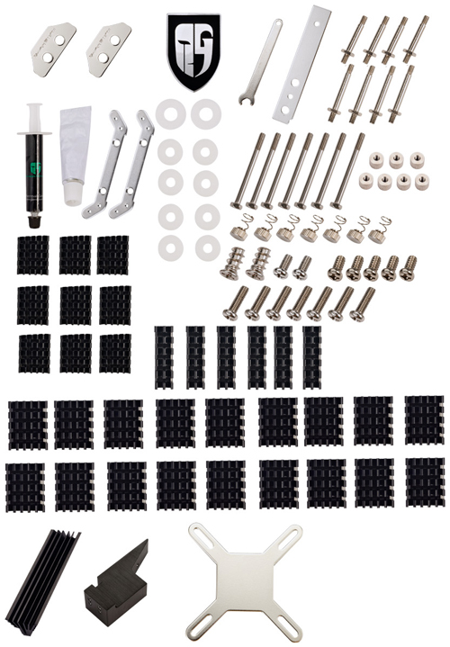 Retention bracket and backplate for the system case back panel;18 tall aluminum heatsinks for the video memory chips;9 low-profile aluminum heatsinks for video memory chips;6 narrow aluminum heatsinks for graphics card VRM components;A heatsink for AMD Radeon HD 6970/HD 6950 VRM;Steel backplate with insulating padding