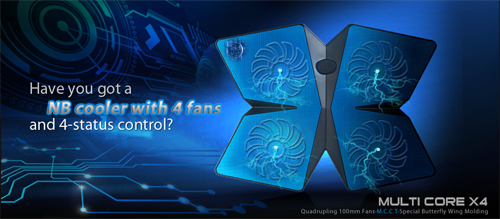 Luxury 4 fans offers strong wind to meet the cooling requirements for the hot notebook computer, also the 4 fans can cope with low power consumption well. Multi Core X4 first applies 4 fans with fan auto- control in the industry so that user can arbitrarily control the cooling level according to the notebooks' heating area condition and the power consumption.